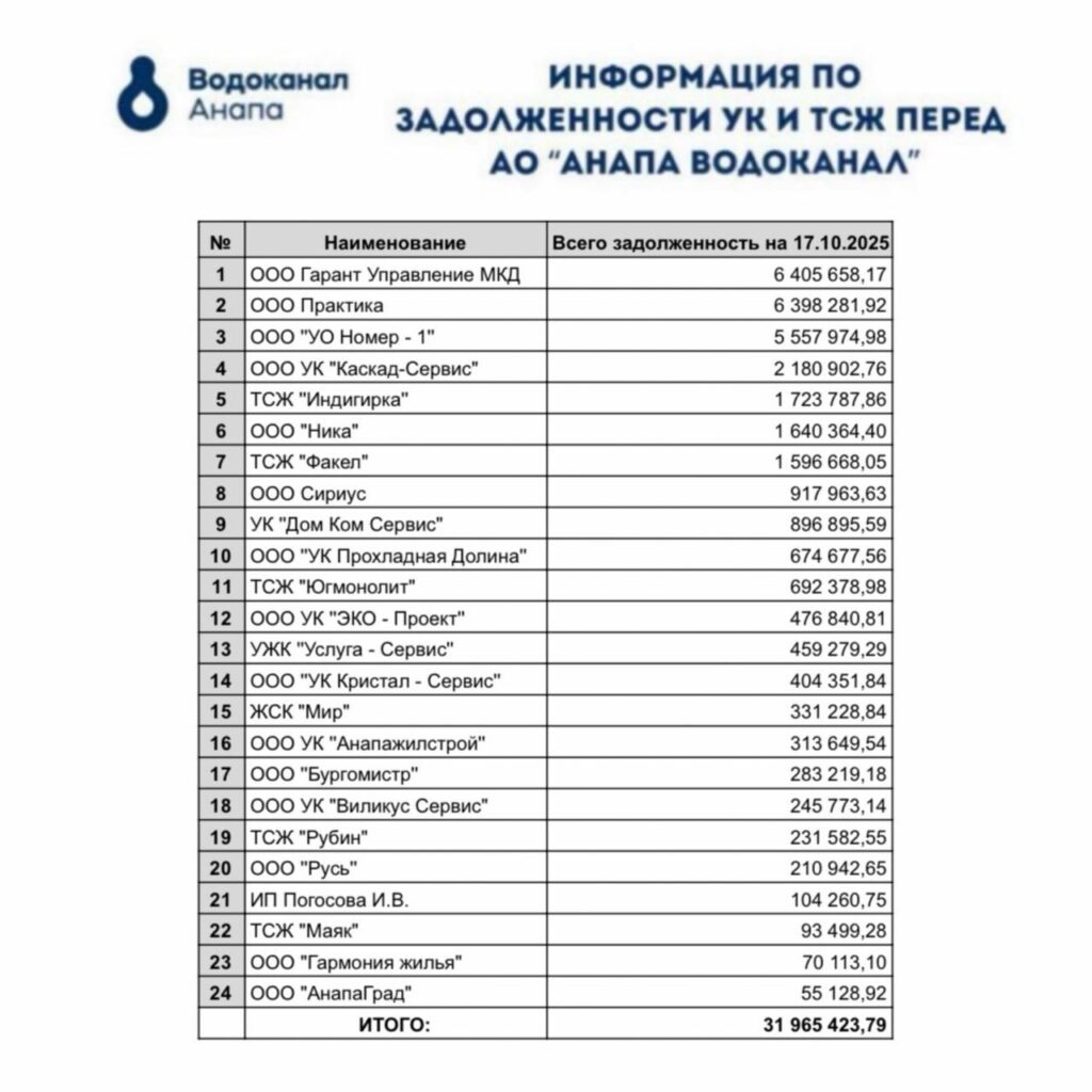 Общая сумма задолженности управляющих компаний, ТСЖ и жителей города-курорта за водоснабжение и водоотведение на 17 октября составила 31 965 423,79 рублей (ранее — 29 291 525,04 руб).