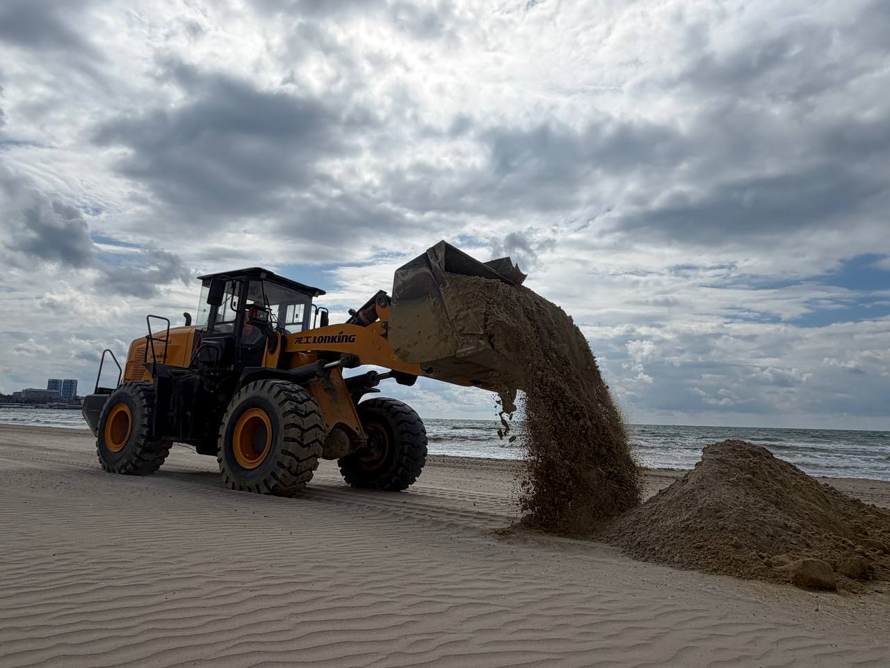 Уже завезено порядка 1000 кубометров грунта, рейсы организованы непрерывно, в том числе в темное время суток. На пляже работают погрузчики, бульдозеры и экскаватор. При увеличении объема завозимого песка количество спецтехники также будет увеличено.