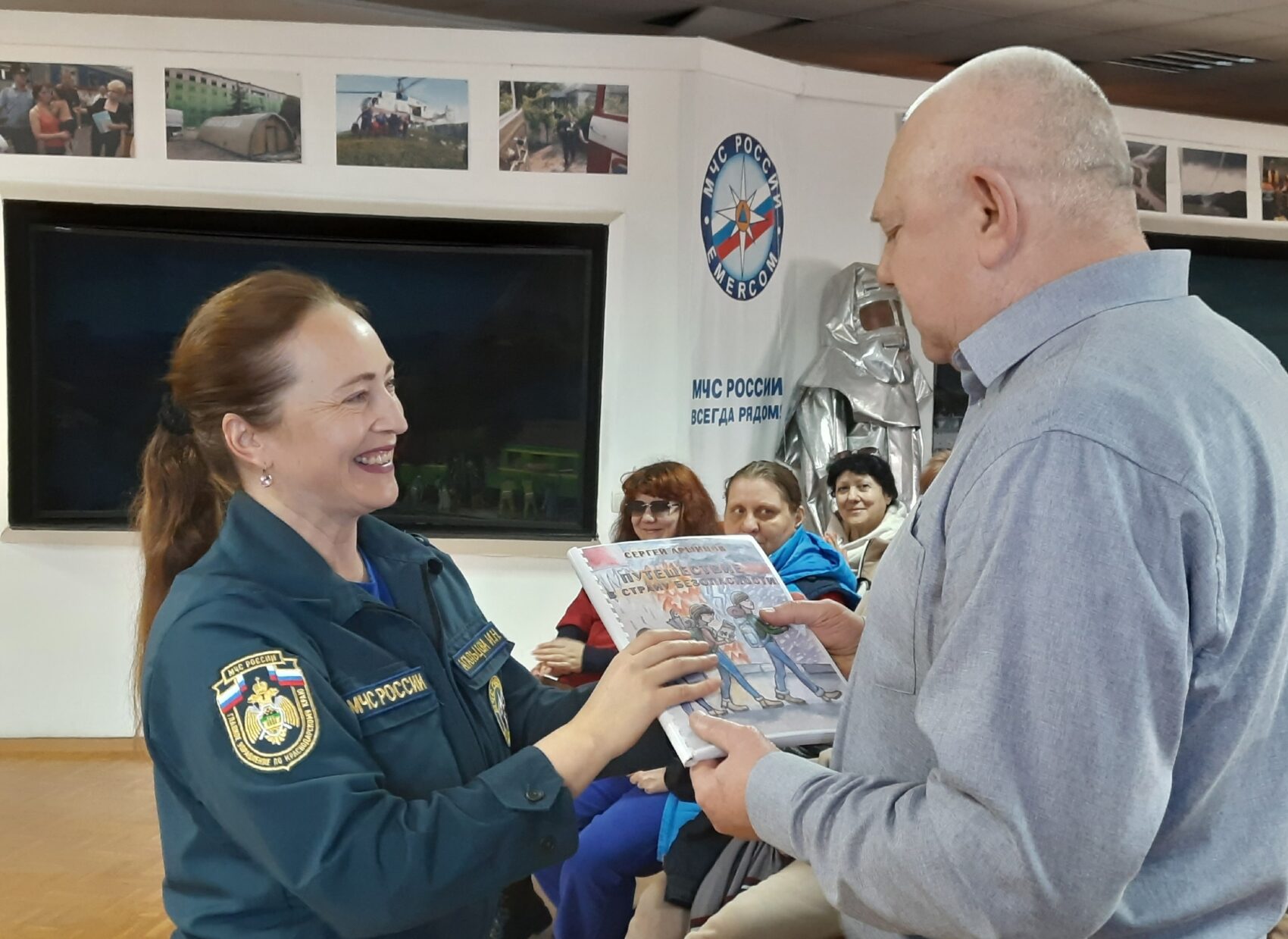 Руководитель выставки Ирина Агальцова вручила председателю Анапского отделения ВОС Андрею Еромолову книгу Сергея Аршинова «Путешествие в страну безопасности», выполненную с помощью шрифта Брайля и её аудиоверсию. В сборник включены избранные стихотворения, написанные автором в разные годы о самых главных правилах безопасности. Отдельный блок посвящен легендарным сотрудникам МЧС. Книга выпущена при поддержке МЧС России и учит набирать номер пожарной службы, сообщать свои адрес и фамилию. Также в ней описаны самые важные ситуации, когда нужно быть максимально собранными.